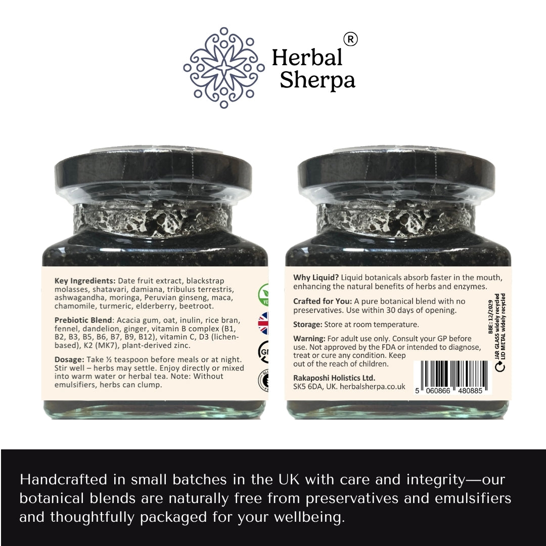 Herbal Sherpa Botanical Blend for Women is a natural liquid product made in the UK using carefully selected botanical ingredients. Crafted in a GMP-certified facility, this product contains plant-based extracts including maca, beetroot, ginger, and chamomile.