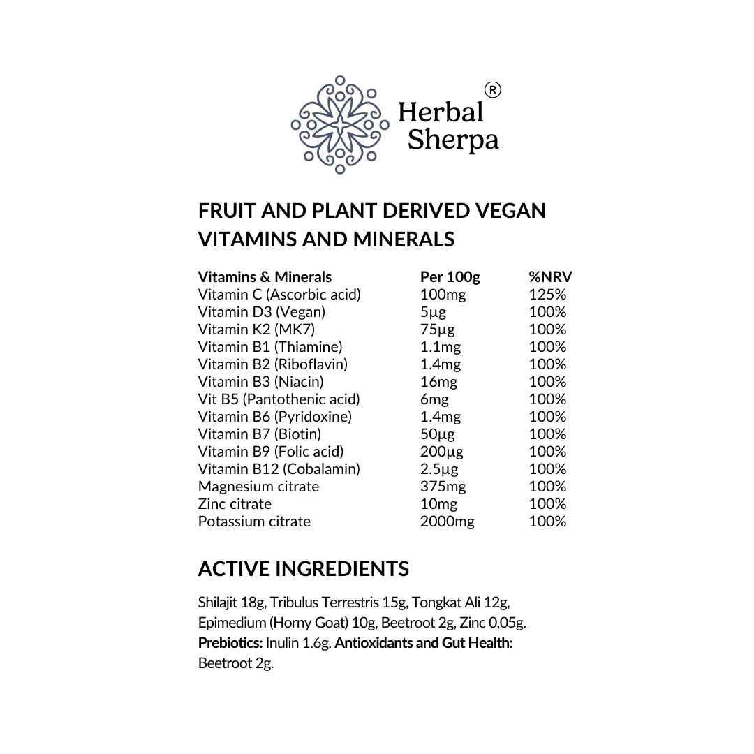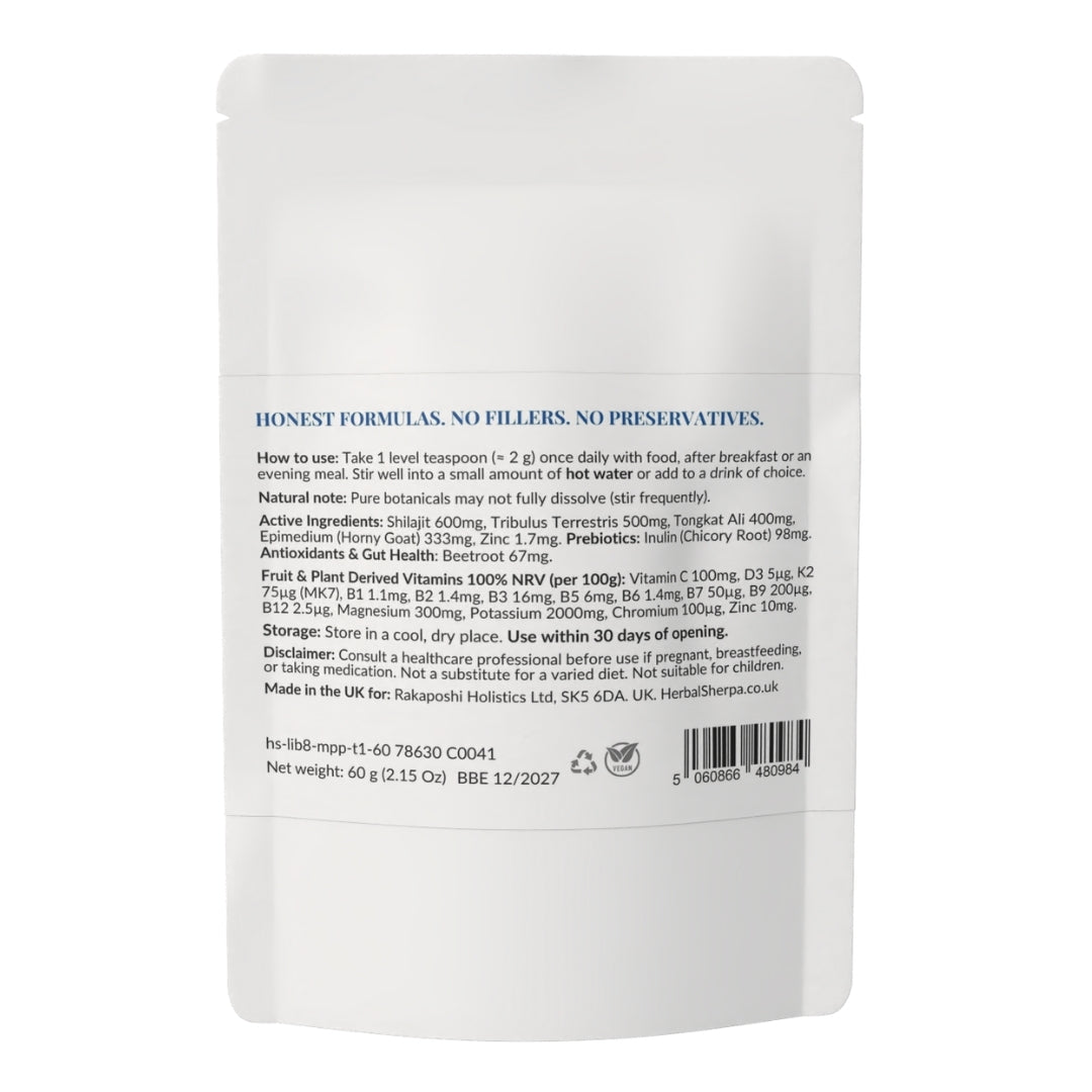 This formula combines Shilajit extract for mineral delivery and cellular energy with traditional men’s vitality botanicals including Tribulus terrestris, Tongkat Ali root extract, and Epimedium (Horny Goat Weed). Beetroot powder supports healthy blood flow and physical performance, while our daily vitamins and minerals contribute to normal testosterone levels, energy metabolism and muscle function.