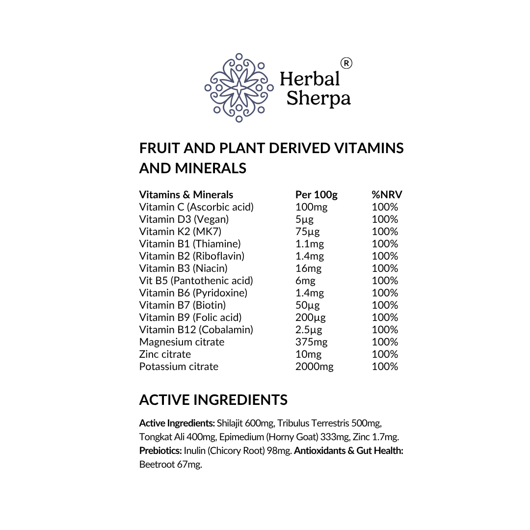 This formula combines Shilajit extract, Tribulus terrestris extract, Tongkat Ali root extract, Epimedium extract and Beetroot powder with daily vitamins and minerals. It is designed to complement general wellbeing, energy-focused nutrition and everyday performance as part of a balanced routine.