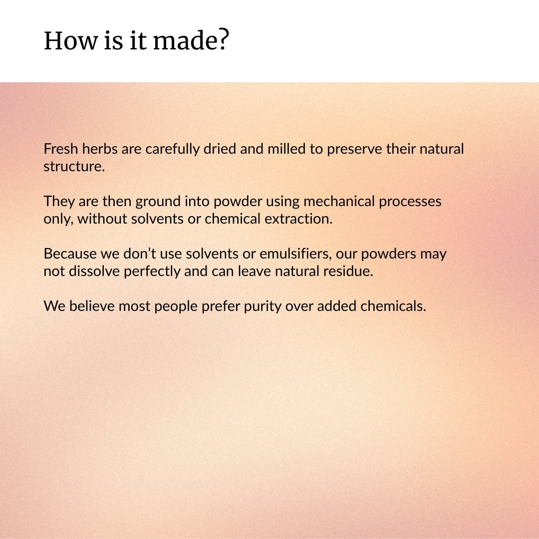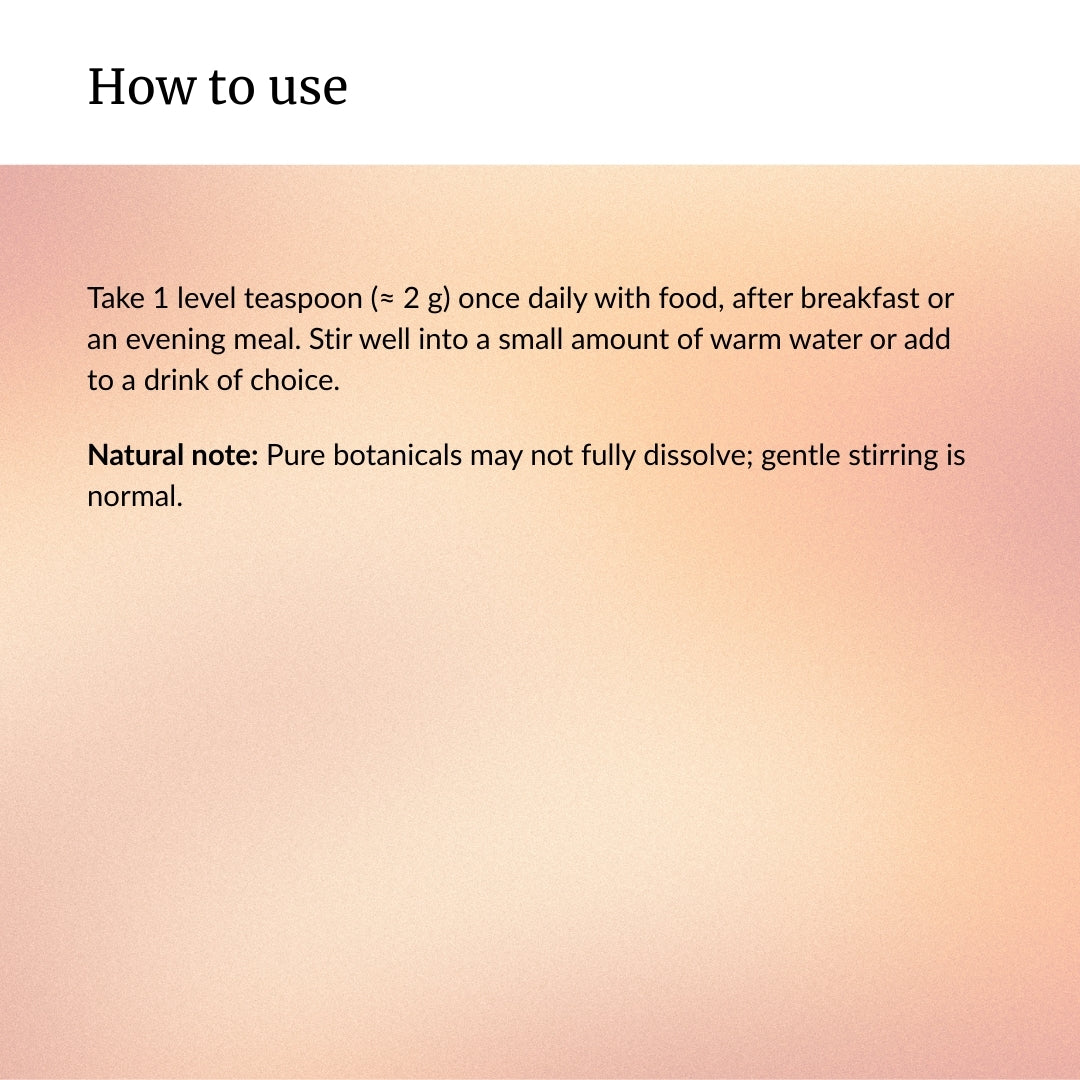 Delivered as a pure powder with prebiotic inulin for gut support and no capsules or fillers, this 60 g pouch fits easily into your daily ritual — sip in warm water, stir into smoothies, or sprinkle over yoghurt or breakfast.