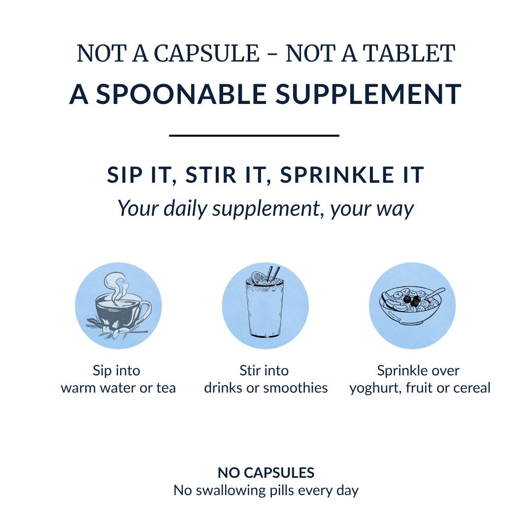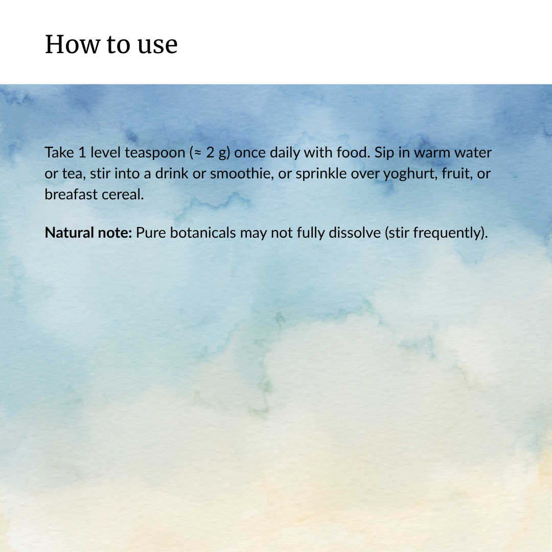 Use 1 level teaspoon (approx. 2 g) once daily with food. Sip in warm water or tea, stir into a drink or smoothie, or sprinkle over yoghurt, fruit or breakfast cereal.