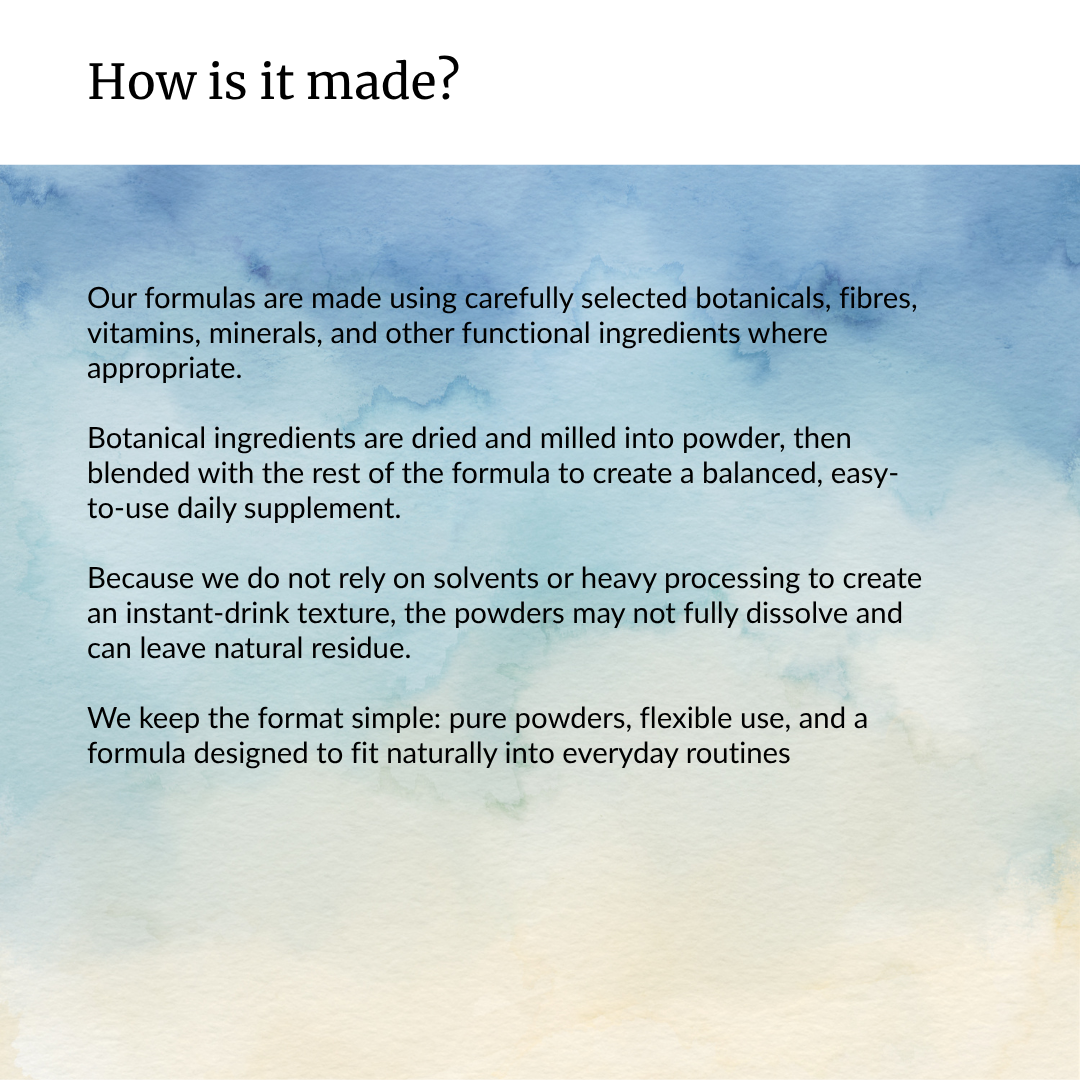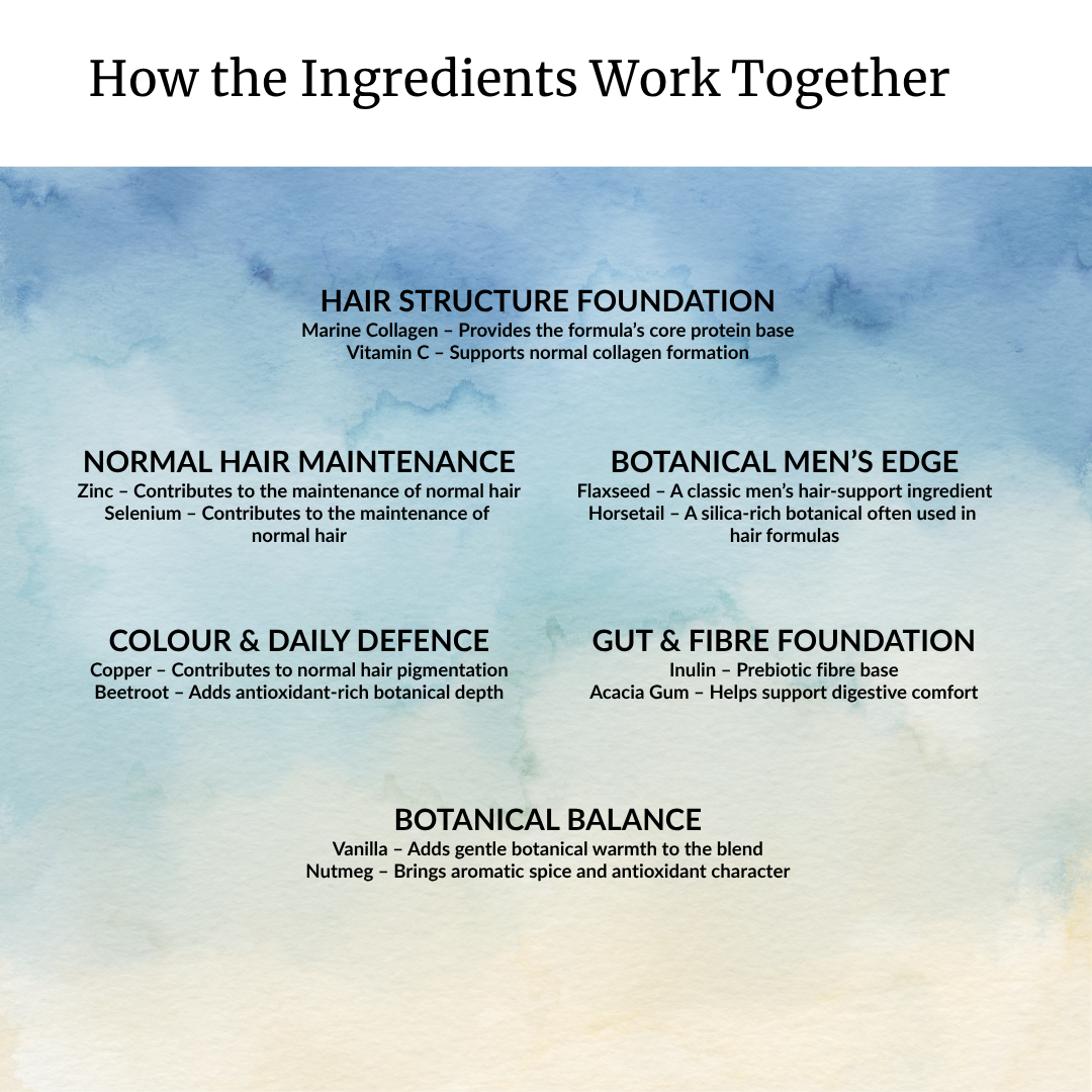 To make the blend easier to use day after day, we include prebiotic inulin, acacia gum and a touch of beetroot, vanilla and nutmeg. The result is a practical 60 g pouch designed to fit easily into a consistent men’s grooming and wellness routine.