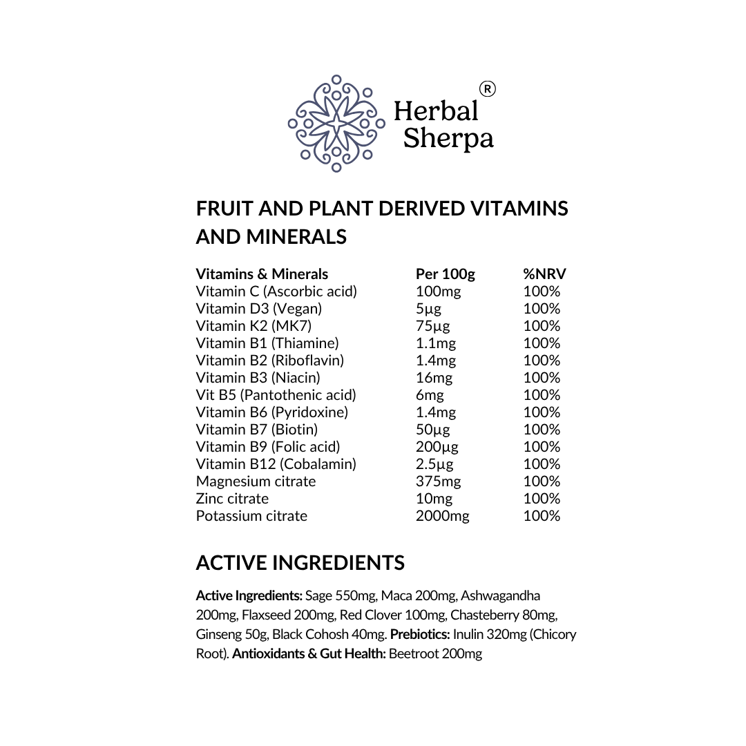 This formula combines sage, maca, red clover, ashwagandha, chasteberry, ginseng and black cohosh, supported by flaxseed, inulin and beetroot. The overall profile is centred on women’s wellbeing, everyday balance and daily vitality.
