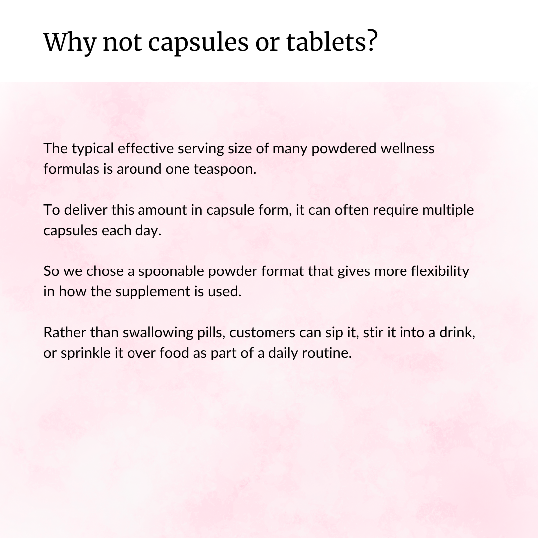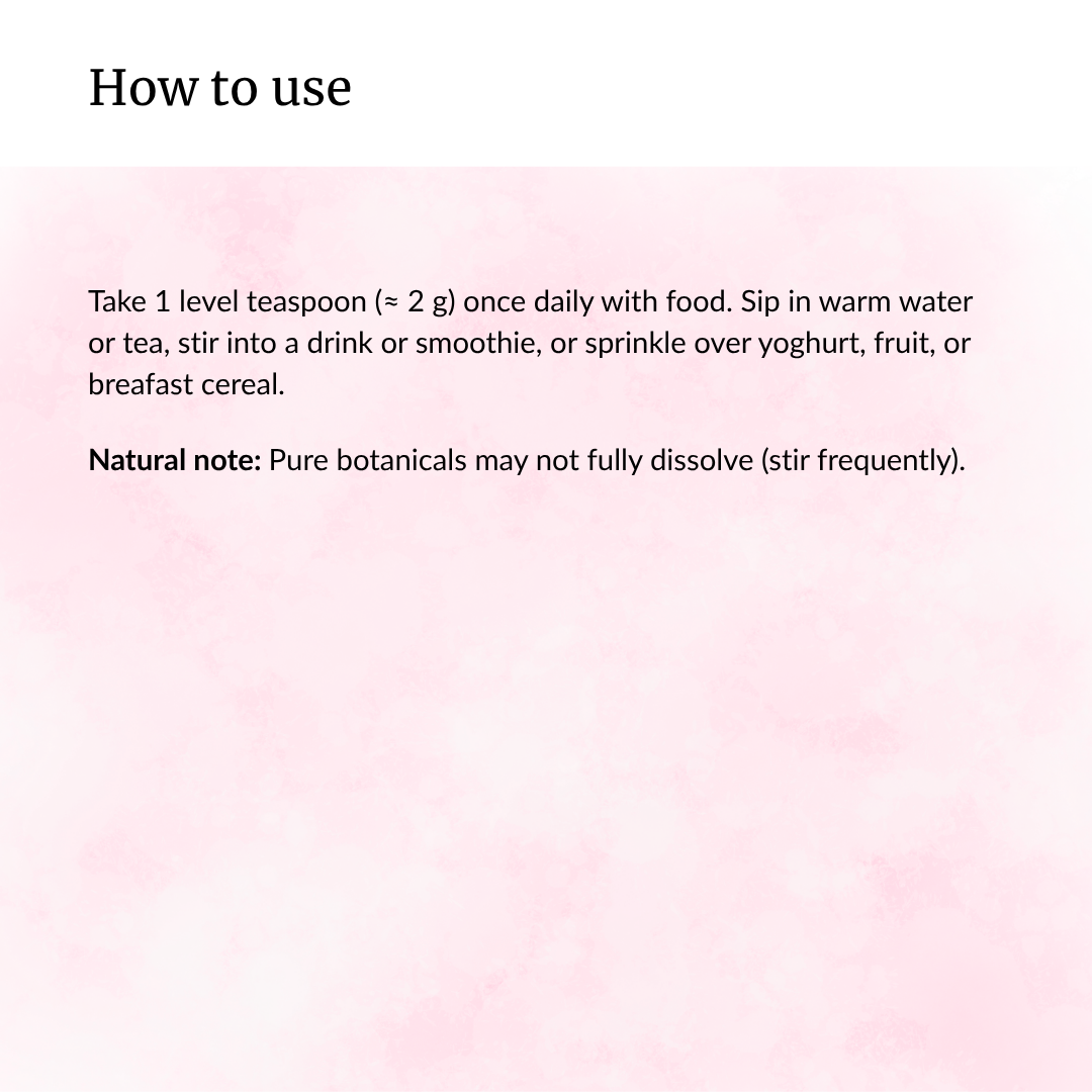 Use it daily: sip in warm water or tea, stir into a smoothie, or sprinkle over yoghurt, fruit or cereal. A simple spoonable format designed for consistency and flexibility.